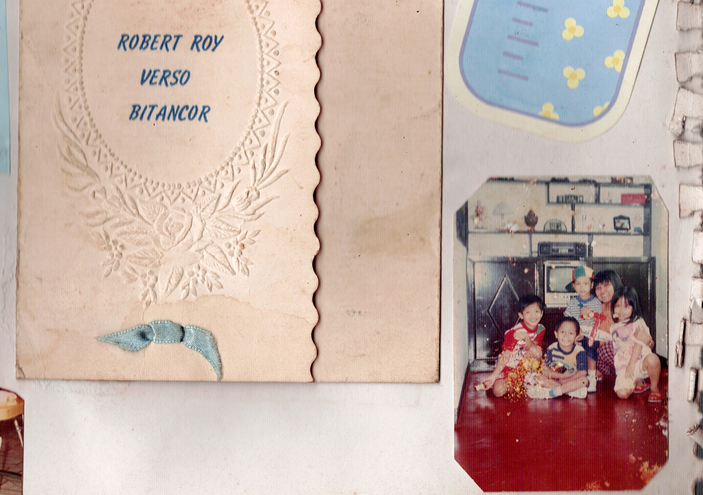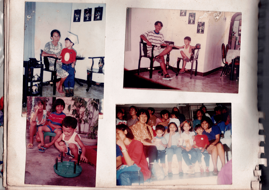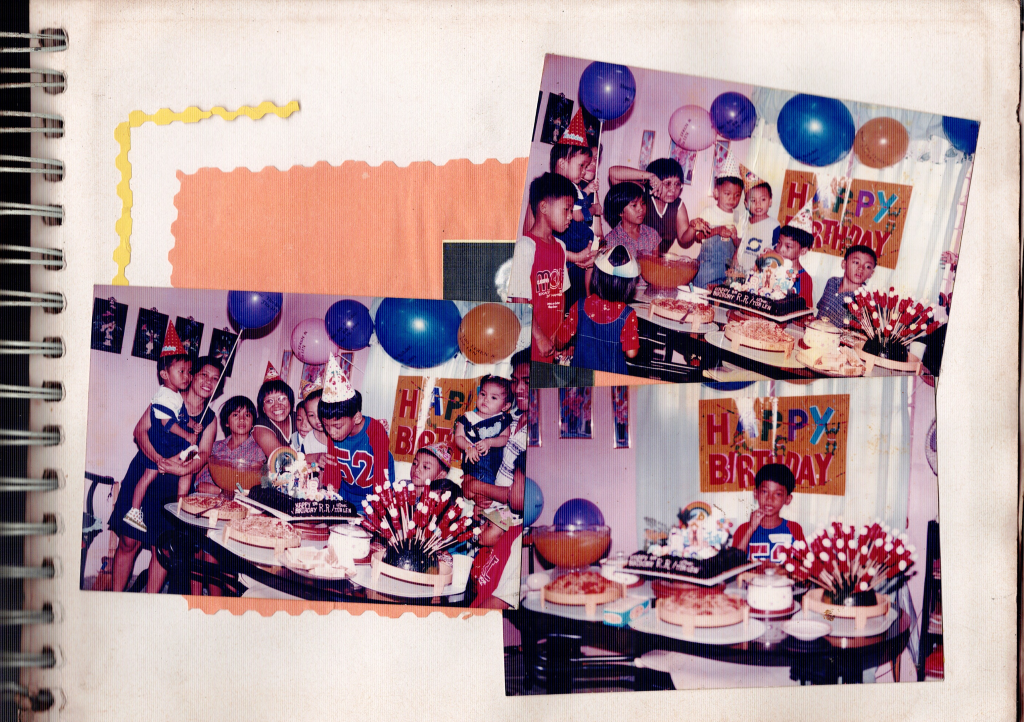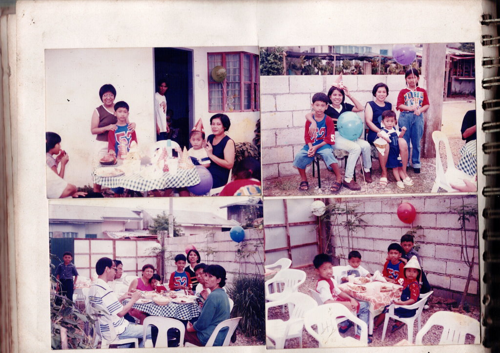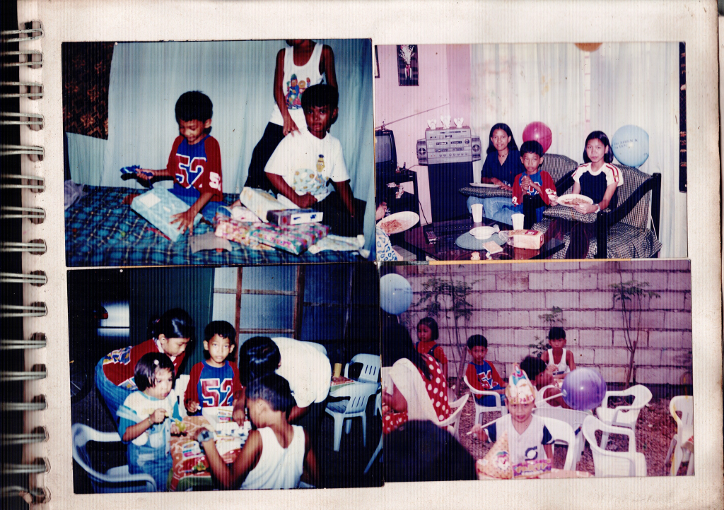 I think 7th or 8th birthday. The last photo include neighborhoods friends, nicole (white-skinned kid) and “may-may” (short haired and wearing red. Can remember the last thing she did to me was to bring Stick-o, because they own a store near our house and he has a brother named Joel, they were my best friends those times. I was around between in grade 1 or 2 at the time this photo taken).